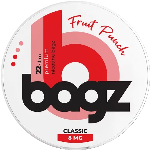 BAGZ Fruit Punch är nikotinportioner med en smak av blandade frukter som ger en frisk och fruktig upplevelse. Förpackningen väger 14 gram och innehåller 22 portioner, där varje portion väger 0,625 gram. Nikotinstyrkan kan vara 8 mg eller 5 mg per portion beroende på variant.