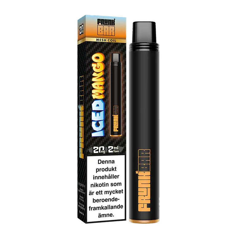 Frunk Bar Mesh Iced Mango är en engångsvape avsedd för användning utan påfyllning eller laddning. Produkten innehåller en e-vätska med smak av mango och cooling. Enheten är förfylld med nikotinsaltbaserad vätska, vilket möjliggör effektivt nikotinupptag och en jämn ångproduktion under användning. Frunk Bar används tills e-vätskan eller batteriet är förbrukat.