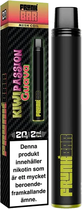 Frunk Bar Mesh Kiwi Passion Guava är en engångsvape avsedd för användning utan påfyllning eller laddning. Produkten innehåller en e-vätska med smak av kiwi, passionsfrukt och guava, vilket ger en tropisk och fruktig smakprofil. Enheten är förfylld med nikotinsaltbaserad vätska, vilket möjliggör effektivt nikotinupptag och en jämn ångproduktion under användning. Frunk Bar används tills e-vätskan eller batteriet är förbrukat.