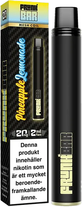 Frunk Bar Mesh Pineapple Lemonade är en engångsvape avsedd för användning utan påfyllning eller laddning. Produkten innehåller en e-vätska med smak av ananas och lemonad, vilket ger en tropisk och frisk smakprofil med syrliga inslag. Enheten är förfylld med nikotinsaltbaserad vätska, vilket möjliggör effektivt nikotinupptag och en jämn ångproduktion under användning. Frunk Bar används tills e-vätskan eller batteriet är förbrukat.