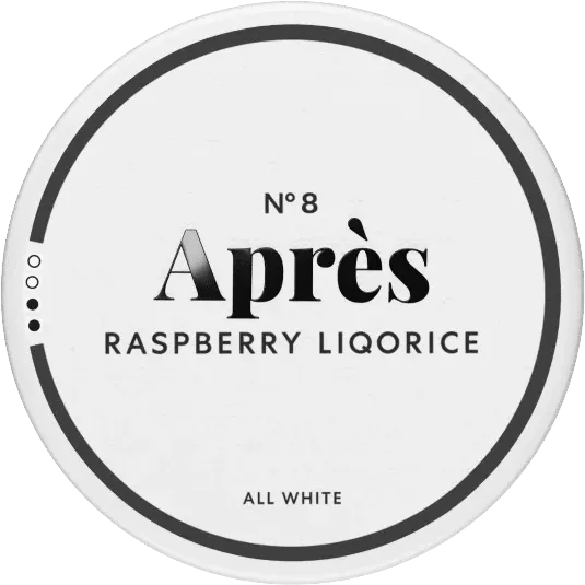 All white-snuset Après Raspberry Liqorice har en smakkombination av hallon och lakrits. Varje dosa innehåller 20 slim-prillor med en normalstark nikotinhalt på 8 mg/g. Förpackningen är miljövänlig och är försedd med ett praktiskt lock som kan användas för att förvara använda prillor. De vita slim-prillorna ger en varaktig smak, låg rinnighet och en längre nikotinrelease. Après är känt för högkvalitativa produkter som tillverkas av växtbaserade material i Stockholm. Deras produkter är helt fria från tobak och är mer miljövänliga.