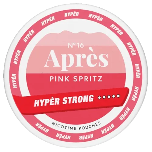 Après No.16 Pink Spritz Hypèr Strong är ett tobaksfritt vitt snus från Après Nicotine AB, utvecklat med ett högre nikotininnehåll. Produkten levereras i slim-format med smala portioner som är utformade för att sitta diskret under läppen.